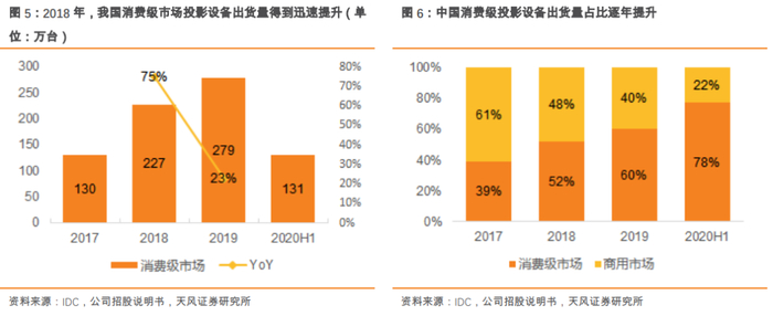 分场景来看,消费级市场成为投影设备最重要的细分市场。在需求端消费升级、消费主力年轻化、显示需求大屏化、家居需求智能化等趋势下,消费级市场投影设备出货量呈迅速增长态势,逐渐成为投影设备重要的细分市场。2017至2020年上半年间,消费级投影市场出货量占比由39%提升40个百分点至78%,未来消费级投影设备市场将具备广阔发展空间。
