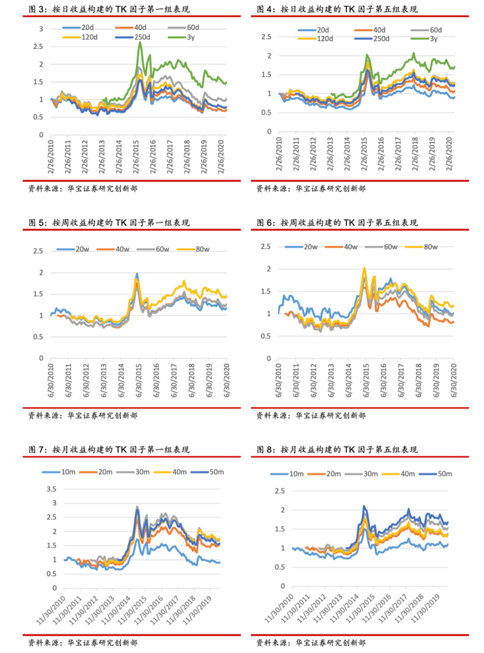 TK 因子的构建和收益率时间窗口长度相关,为了测试 TK 因子对时间窗口的敏感度,我们 分别以日度、周度和月度收益率三个频率来构建 TK 因子,并对比不同时间周期构建的 TK 因 子表现的差异。