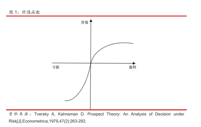 价值函数具有以下三个特点:一是价值函数以参考点为界分为盈利区和亏损区;二是盈利 区间表现为下凹,即风险回避特征,而在亏损区域表现为上凸,即风险寻求特征;三是亏损区域的斜率大于盈利区域的斜率,呈现不对称特征,表明亏损带来的负效用高于盈利带来的正效用。