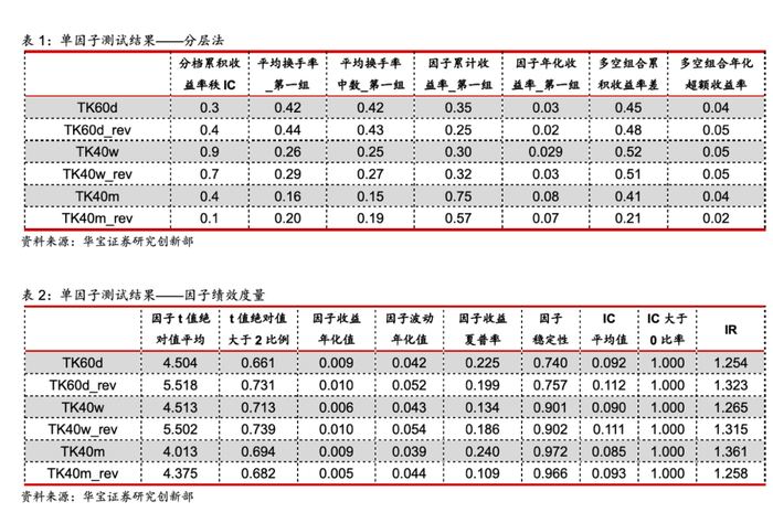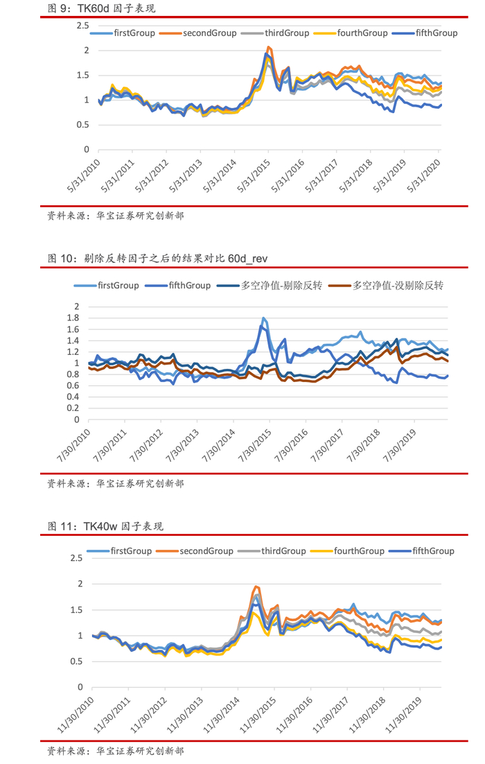 下面我们研究不同周期对于因子的影响。对比单因子测试结果中因子的绩效,可以发现时间周期较长的 TK 因子,例如TK40m 因子的表现稍强于短时间周期构建的 TK 因子,并且因子在剔除短期反转因子的影响之后仍有显著的选股效果,说明TK 因子虽有部分选股效果是由于 短期反转带来,但TK因子还具有短期反转因子所不能替代的增量信息,这也证明了TK因子在选股方面仍具有有效性。TK40m因子年化收益率达到 8%,剔除 Rev因子后仍有 7%,多空组合的年化超额收益率为 2%。
