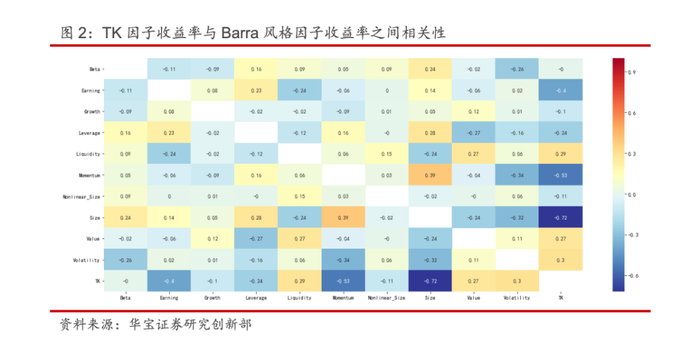 我们首先探究了 TK 因子与现有的风格因子之间的相关性,我们选取了比较有代表性的十 个 Barra 风格因子,包括 Beta、Earning、Growth、Leverage、Liquidity、Momentum 、Nonlinear_Size、Size、Value 和 Volatility 因子这十个比较有代表性的风格因子。计算 TK 因子 与这十个风格因子的因子收益相关性可知,虽然经过行业和市值中性化处理,但是 TK 因子仍与部分因子例如规模因子 Size 和动量因子 Momentum 的具有较高负相关性,一方面说明 TK 因子偏好市值较大的因子,另一方面也说明 TK 因子有一定的反转效应。后续我们将测试在行业中性和市值中性的基础上,进一步剔除短期反转因子之后的 TK 因子选股效果。