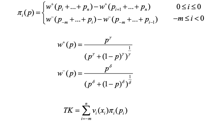 权重函数也具有两个特点:一是人们通常高估小概率事件的可能性,也就是 p 在 0 附近的 小概率区域,决策权重往往高于其概率值,即人们高估小概率事件,即π(p)> p;二是互补概率的决策权重之和小于确定性事件的决策权重,即π(p)+π(1- p)≤1。