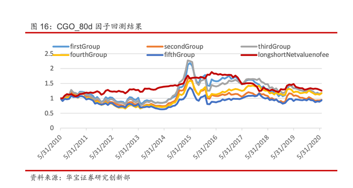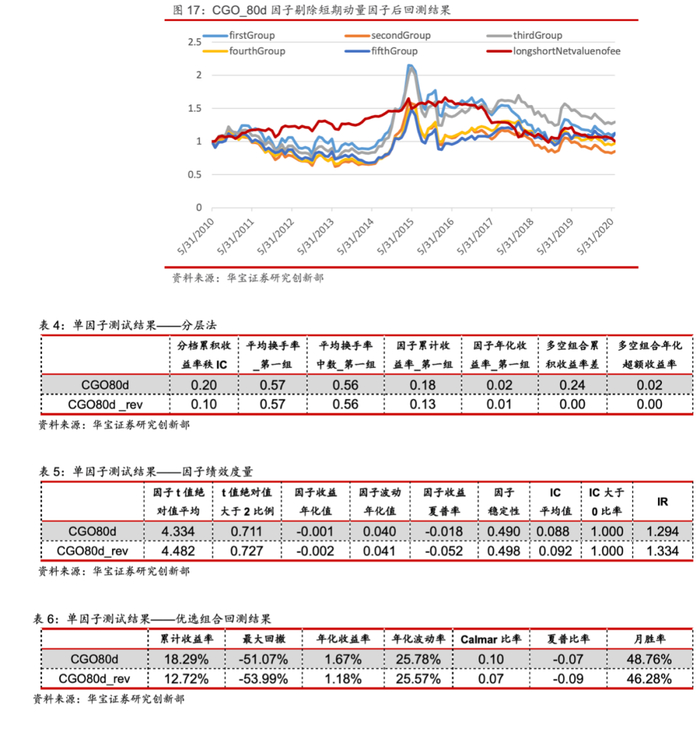 未实现盈利量 CGO 因子的测试结果则显示该因子选股效果较弱,即使构建不同时间周期的 CGO 因子,效果亦提升不明显,而且该因子在剔除了短期反转因子 Rev 的影响选股效果基 本消失,说明 CGO 因子的选股效果很多程度而言和反转因子重合较多。