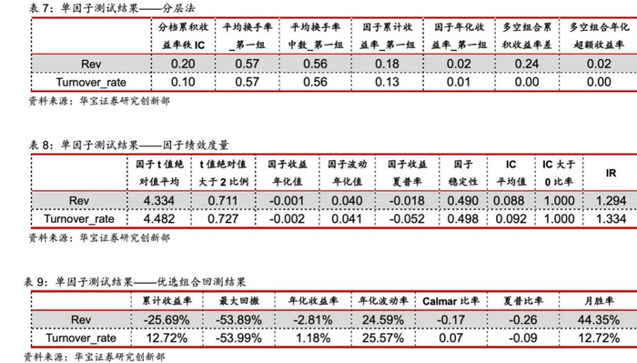 另外我们还测试了行为金融相关的短期反转因子Rev和换手率Turnover_rate 因子的选股 效果,发现这两个因子在选股效果上并不稳定,可以断言二者基本不具备长期选股效果,也就是不具备 alpha 因子的特性,因此不适合作为选股因子使用。