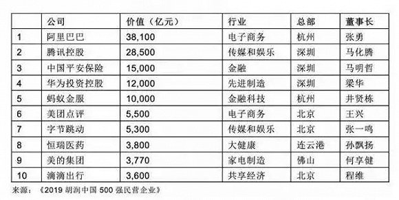 榜单前十名民企依次为:阿里巴巴(3.8万亿)、腾讯控股(2.9万亿)、中国平安保险(1.5万亿)、华为投资控股(1.2万亿)、蚂蚁金服(1万亿)、美团点评(5500亿)、字节跳动(5300亿)、恒瑞医药(3800亿)、美的集团(3770亿)和滴滴出行(3600亿)。