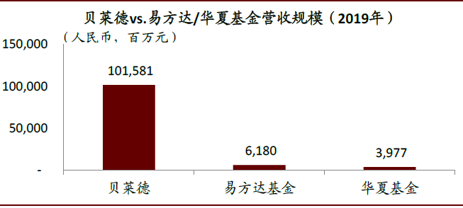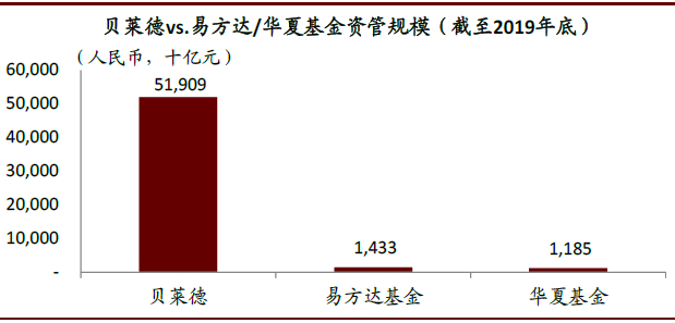 ►规模体量上:外资头部资管机构显著高于中资头部机构。2019年,贝莱德营收1,016亿元(145亿美元)/净利润313亿元(45亿美元),远高于易方达基金62亿元/17亿元、华夏基金40亿元/12亿元的体量。从资管规模来看,截至2019年末贝莱德管理资产规模52万亿元(7.4万亿美元),显著超过易方达1.4万亿元、华夏1.2万亿元的规模(含专户及子公司业务)。