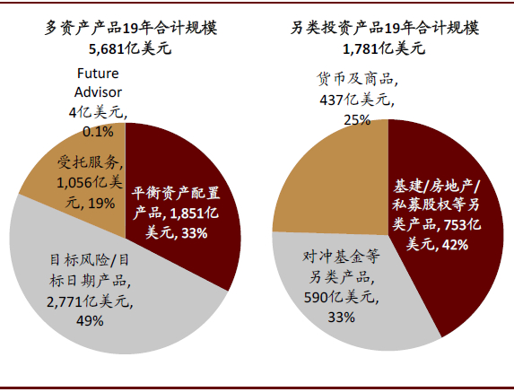 ● 产品类型层面:从全球资管产品结构来看,资金正逐步从传统的主动管理型产品向被动型、另类型和解决方案型投资产品转移——主动类/被动类/解决方案&平衡型产品/另类产品的规模占比已从2003年的76%/9%/6%/9%转变为2018年的51%/19%/14%/16%,其中:1)以被动型指数基金及ETF为代表的被动型产品:长期来看,在资本市场有效性提升、主动管理产品跑赢指数难度增加的趋势下,我们预计交易低费率、高透明度、高便利性的被动型产品将愈发受到客户青睐。2)以对冲基金、私募股权、房地产、基础设施和大宗商品基金为代表的另类型产品:在传统投资被动化的背景下,客户资金对主动管理的诉求部分向高收益、低流动性的另类投资迁移,而由于其非标准化程度较高、对垂直领域的专业能力要求更高,通过较高的管理费率及业绩报酬计提机制导致盈利能力更强。3)以大类资产配置、目标养老、目标日期、通胀保护等为代表的解决方案型产品:基于客户个性化的需求提供整体解决方案,具备财富管理和机构投顾业务属性。
