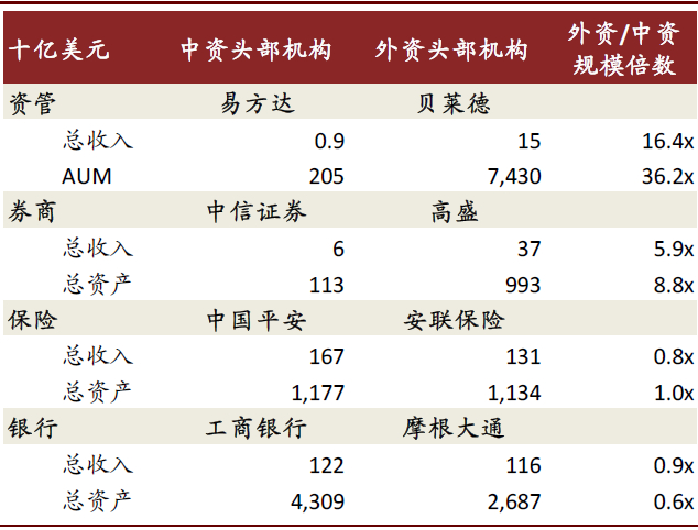 ►从全球金融业竞争格局来看,外资在不同金融子行业竞争力排序为资管>投行>保险>银行。根据各金融子行业的全球领先机构排名,全球AUM Top20的资管机构均为欧美外资机构,且相较国内头部资管机构(如易方达/华夏)在规模上遥遥领先。相比之下,1)银行:工农中建四大行包揽全球银行业资产规模Top 4;2)保险:国内有两家保险机构资产规模跻身全球Top 20;3)证券:国内金融分业经营、国际主要市场均为混业经营的背景下,国内券商从业务总收入及资产规模的角度较国际投行差距明显,投行收入前十大券商中尚无中资机构;但从相对业务规模比较来看,投行业务与外资的差距仍明显小于资管业务。