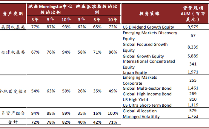 ● 以专业稳健的投研能力、高度合规的风控文化为标签的品牌。外资资管机构通过培养投研人才、拓展投资范围、强化投研能力,持续跑赢业绩基准,如普信、摩根大通资管分别有89%、83%的管理资产在过去10年内跑赢Morningstar中位数基准;另类投资机构黑石管理资产在过去30年内均保持较高投资收益。