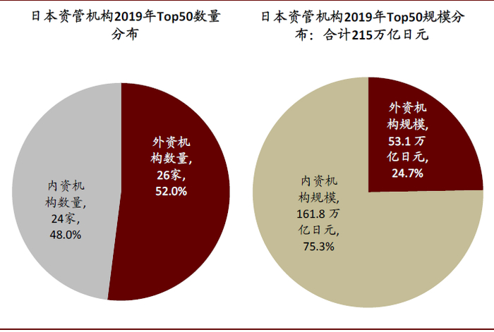 图表: 日本Top50机构中外资数量/规模占比52%/25%