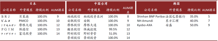 图表: 日本、中国台湾、韩国三地市场Top 15资管机构中的外资机构股权形式