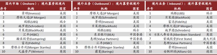 ►从产品类型及资金属性来看,被动产品及另类型产品凭借其较强的规模效应及盈利能力愈发受到青睐,同时解决型产品的推出亦能够有效满足投资者多样化的投资者需求、实现特定的投资目标。此外,零售客户对本土银行/券商/互联网平台等渠道已存在较高依赖度、外资机构进入困难,叠加机构客户对外资机构投研/风控等品牌的信任,使得外资机构在机构端可能更易受到青睐。