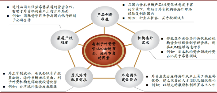 参照日本、中国台湾和韩国市场的经验,我们认为影响外资资管机构业务份额占比的因素主要包括:1)居民海外配置需求;2)渠道开放程度;3)产品创新程度;4)机构委外需求;5)本地团队建设能力。整体而言,在居民海外配置需求高(外资可发挥海外资产配置优势)、渠道开放程度高(外资可与当地渠道展开深度合作)、产品创新加速(外资可发挥产品研发优势)、机构资金委外放开(如允许外资进行养老金委外管理)、团队建设能力强(外资可充分发挥海外及本土员工的互补优势)的情形下,外资机构加速布局的优势将体现得更为明显。具体来看:
