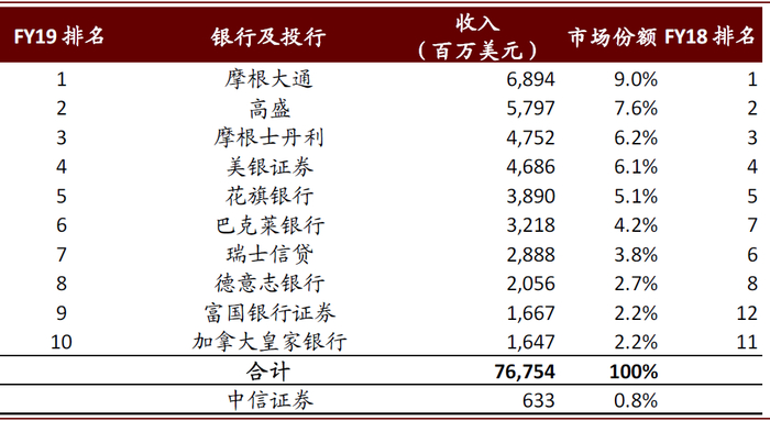 图表: 全球投行业务收入排名Top10中无中资机构、中资Top1投行收入份额~1%
