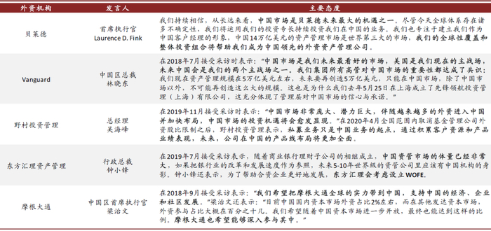 2020年4月1日起国内公募基金外资持股比例限制正式取消、行业实现全面开放;考虑到资管行业的轻资本属性以及外资在投研/产品/机制/科技等方面的领先优势、并借鉴亚洲成熟市场的开放发展经验,我们认为资管行业可能会是此轮金融开放浪潮中受外资影响最大的子领域。外资机构基于各自的资源禀赋,或通过直接控股基金公司、与境内强势零售渠道或商业银行合作、创新产品形式等方式快速切入中国市场,对中国资产管理行业形成一定的鲶鱼效应。参见中金报告《中国资产管理行业:面向未来的“一二三四五》(2019.12.06)
