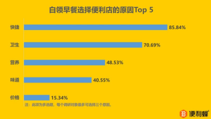 为什么白领更青睐便利店?调查指出,吸引他们的首要原因是“快捷”,获得85.84%的认可,满足早上赶时间的需求;紧随其后是“卫生”,有70.69%的关注量,然后才是“营养”,有48.53%。比起午餐,白领对营养早餐的要求低很多。