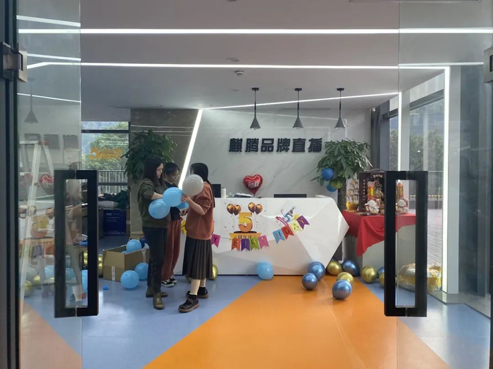 该公司前台挂着“麒腾直播品牌”六个大字。根据天眼查信息,“麒腾”是杭州天映母公司杭州麒腾网络信息科技有限公司的名字。杭州麒腾旗下拥有杭州天映、深圳播播看网络科技有限公司等一共5家子公司。
