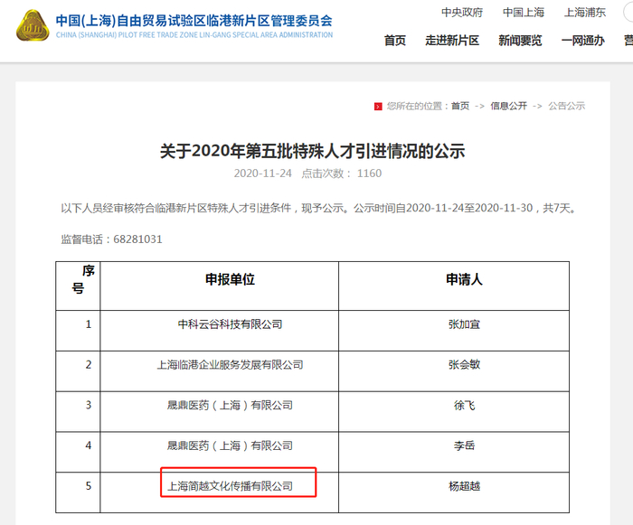 上海自贸区临港新片区管委会官网11月24日对2020年第五批特殊人才引进情况进行公示,时间自11月24日至11月30日。其中,上海简越文化传播有限公司所属申请人杨超越,经审核符合临港新片区特殊人才引进条件,现予公示。