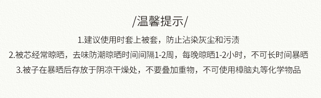 平时,不用洗、不用晒,存放前,在避阳处晾 4~5 小时,被子会自然排出水汽,再使用时,舒爽体感如初。