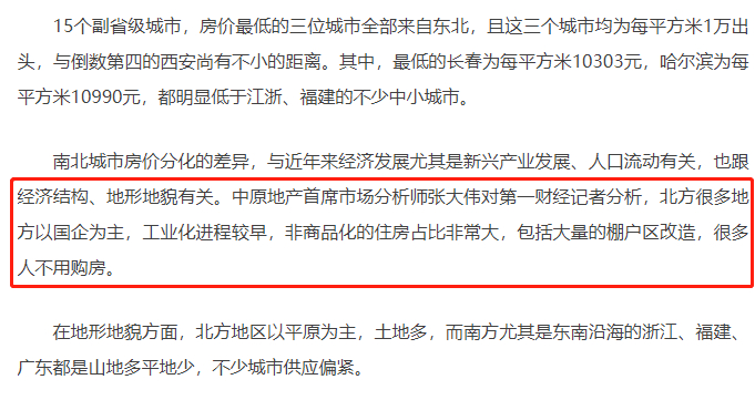 《第一财经》认为,北方房价下跌的根本原因,是因为北方很多地区是以国企为主,非商品房的比例很大,其中还有大量的棚户区改造,“所以很多北方民众不需要买房”。