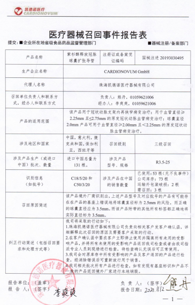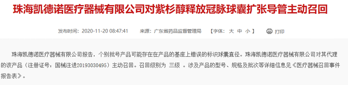 中国经济网北京11月25日讯(记者 何潇 马先震) 11月20日,广东省药品监督管理局网站发布了珠海凯德诺医疗器械有限公司对紫杉醇释放冠脉球囊扩张导管主动召回的公告。日前,珠海凯德诺医疗器械有限公司报告,个别批号产品可能存在在产品的基座上错误的标识球囊直径。珠海凯德诺医疗器械有限公司对其代理的该产品(注册证号:国械注进20193030495)主动召回。召回级别为三级。