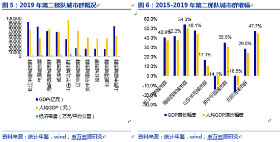 第二梯队城市群发挥优势补短板,增长快,潜力大。第二梯队为快速发育期城市群,包括长江中游、中原、海峡西岸、成渝、山东半岛、辽中南、关中平原、哈长、北部湾、山西中部等10个国家级城市群。从经济生产总量看,2015-2019年第二梯队城市群经济生产总值从33.4万亿元提高到44.1万亿元,增长幅度为31.9%,2019年占全国GDP的比重为44.5%。与此同时,第二梯队的单个城市群建设发展也逐步进入正轨,其中长江中游城市群的经济生产总值已经超越珠三角以及京津冀城市群,中原、海峡西岸以及成渝城市群的经济生产总量均超过6.5万亿元。从发展潜力看,2015-2019年间海峡西岸、成渝以及山西中部城市群的累计经济生产总值增幅突破45%,接近长三角城市群;中原以及长江中游城市群的累计增幅突破40%,关中平原城市群的累计增幅也达到35.5%,发展势头高涨。从经济密度来看,第二梯队内以山东半岛为代表的城市群,经济密度高达6162万元/平方公里,但增速相对较慢;以海峡西岸、成渝、山西中部、中原、长江中游、关中平原为代表的城市群,经济密度分布在1500-3000万元/平方公里之间,但近5年间经济密度增长幅度都高于35%。