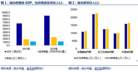 其一,城市群加速聚集,汇集了全国九成GDP、八成人口。2015-2019年我国21个城市群经济生产总值由67.0万亿元上升至90.6万亿元,增长幅度达35.2%,经济密度由1850万元/平方公里提升至2502万元/平方公里。2019年21个城市群生产总值占全国GDP的比重高达91.4%,经济密度约为全国均值的2.5倍。从人口集聚来看,2015-2019年我国21个城市群常住人口由11.7亿人上升至12.0亿人,2019年城市群常住人口占全国总人口比重达85.8%,其中京津冀、长三角、长江中游、成渝以及中原城市群都已成为“亿人俱乐部”。珠三角城市群因其经济活跃以及相对宽松的人才引进政策,2015-2019年常住人口增长幅度为9.5%,人口密度高达1160人/平方公里,城市群在发展的过程中集聚效应加速显现。