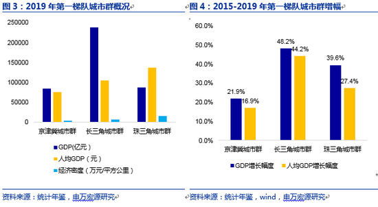 第一梯队城市群资源荟聚,向世界级城市群迈进。其主要包括京津冀、长三角、珠三角三大头部城市群,城市群发育趋于成熟。从经济生产总量看,2015-2019年第一梯队经济生产总值从29.2万亿元上升至40.9万亿元,增长幅度为40.1%,2019年占全国GDP的比重为41.2%,有效带动全国经济发展。从人均GDP来看,2019年长三角、珠三角的人均GDP均突破10万元,京津冀城市群由于区域内部差异大,人均GDP相对较低。从经济密度看,第一梯队城市群行政区域土地面积仅占全国的6.5%,但珠三角与长三角城市群的经济密度分别高达15815万元/平方公里和6730万元/平方公里。在市场主体上,第一梯队城市群内大企业集聚,2020年世界500强中大陆地区共有117家企业入选,其中北上深三地占据了2/3的入选企业。