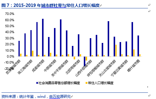 其五,城市群内人口集聚助推消费需求增长。2015-2019年城市群内社会消费品零售总额稳步增长,2019年第一梯队的长三角城市群以8.9万亿元遥遥领先,体量高于京津冀与珠三角城市群的总和;第二梯队和第三梯队的城市群社会消费品零售总额分布相对平均,分别集中在1-4万亿元和1-4千亿元的区间,其中第二梯队的长江中游、中原、成渝城市群的社会消费品零售总额已逼近第一梯队的京津冀、珠三角城市群。从增速看,2015-2019年“亿人俱乐部”中成渝、长江中游以及中原城市群的社会消费零售总额的累计增长幅度分别为62.1%、56.4%以及46.5%,人口集聚加速助推消费需求稳步增长,形成经济发展内生动力。