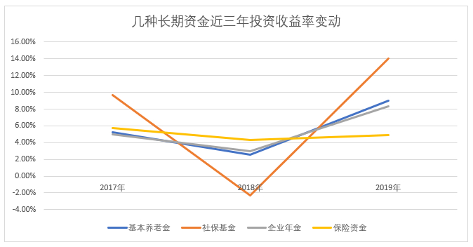 第一财经记者统计公开数据发现,企业年金和保险资金在2019年分别取得了8.3%和4.94%的投资收益率,不敌社保基金会受托管理的基本养老保险基金9.03%的收益率水平,但同样是社保基金会操盘的社保基金2019年取得了14.06%的高投资收益率,在这几类长期资金中居首位。