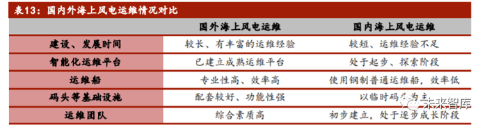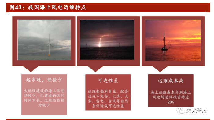 提高海上风电运维效率,降低运维成本是降低海上风电成本的关键因素之一,也 是提升投资回报的重要手段。海上风电运维的难点主要是可达性差,故障待修时 间长,发电量损失大;缺乏专业装备,运维效率低,安全风险大;受环境及场地 限制,导致大部件维修困难多,费用高;海洋气象预测精度尚不满足现有长距离 海上风电运维的现状;多主机运维队伍资源共享尚存在经济性壁垒。由于国内海 上风电处于初步发展阶段,国内海上风电尚无长期运营经验和成本数据积累,海 上运维市场尚处于起步阶段。根据目前国内已建成的海上风电场运维情况看,海 上运维工作量是陆上的 2-4 倍,费用远超陆上风电。尽管海上运维门槛高、起步 晚,但随着我国海上风电的发展,未来将形成陆上运维和海上运维市场的细分格 局,通过前瞻性布局,提高海上风电运维效率,降低运维成本。