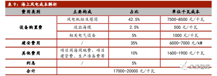 建安费用约占总成本的35%,单位千瓦成本约 6000-7000 元/kW。由于海上施工 条件复杂、施工难度大,施工所需的关键装备(如海上风电机组基础打桩、风电 机组吊装等)专业可用的大型船机设备较少,船班费用高昂,相对陆上风电,海 上风电的建安费用占总成本的比重较大。