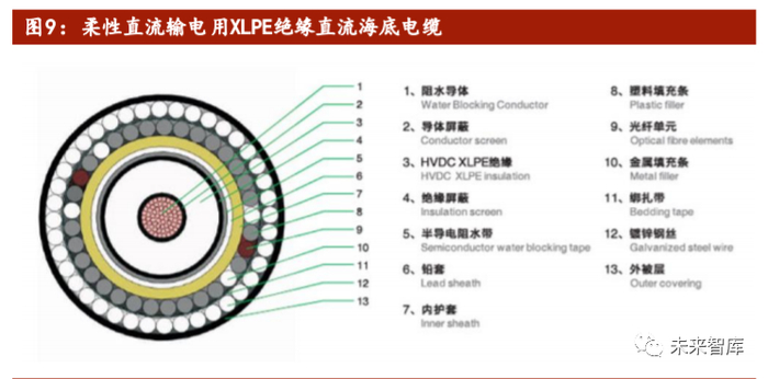 海缆向直流化、动态化方向发展。随着海上风电朝着深远海发展,对海底电缆提 出了更高的要求,海底电缆向直流化、动态化方向发展。柔性直流输电技术输送 效率高、线路损耗小,有利于长距离输电,稳定性高,不产生大的短路和环线电流,能解决风力发电场间歇式电源并网的问题,大幅改善大规模风电场并网性能, 在海上风电、长距离海上输电项目中应用广泛。