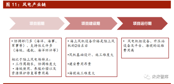 海上风电产业链长,降本增效空间大。海上风电的产业链涉及前期的协调工作、 项目建设期的主机装备、电气(海上升压)、电力输送(电缆)、安装施工等以及项 目运行期的运维工作,产业链长于陆上风电,因此降本增效的空间更大。