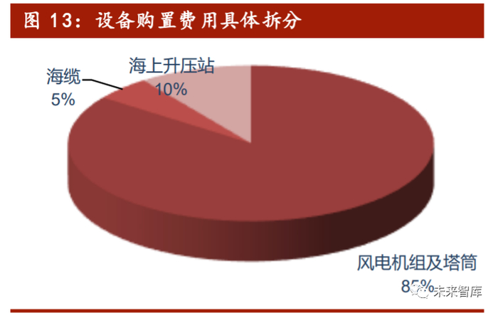 设备购置费约占总成本的50%,降本空间大。其中,风电机组及塔筒约占设备费 用的 85%,单位千瓦成本约 7500~8500 元/千瓦,对整体设备费用的影响较大。海上风机所处环境恶劣,风机易腐蚀,同时我国海上风资源条件复杂,在长江以 南海域,大部分地区平均风速较低,又有台风威胁,因此对海上风机的性能有较 高要求,目前海上风机的单位成本约为陆上风机的 2 倍。降低海上风机成本的关 键一方面是通过技术进步提高风机性能,另一方面是依托规模效应,批量生产降 低边际成本。国家能源局下发的《风电发展“十三五”规划》中明确规定到 2020 年海上风电并网装机容量达到 5GW,开工规模达到 10GW,这将给整机厂商带来可 预期的大市场,我们预计通过海上风机的批量化生产,设备单位千瓦价格将会有 1000~2000 元的下降空间。