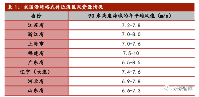 我国海风资源丰富,大部分近海海域90米高度年平均风速可达6.5-8.5m/s,具备 较好的风能资源条件,适合大规模开发建设海上风电场。我国海岸线长约18000 多公里,拥有6000多个岛屿,近海风能资源主要集中在东南沿海及其附近岛屿, 包括苏州、江苏、浙江、福建、上海、广东等地,这些地区均属于低风速地区, 相较而言,近海90米高度海域平均风速可达6.5-8.5m/s,海上风资源更充足。根据风能资源普查成果,我国5-25米水深、50米高度海上风电开发潜力约200GW;5-50米水深、70米高度海上风电开发潜力约500GW。