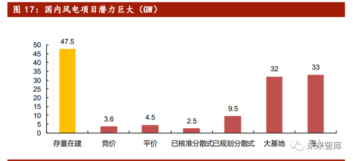 已核准存量项目充足,新增装机有望高增长。根据彭博新能源数据,截至 2019 年底,国内陆上和海上在建带补贴存量项目约 47.5GW,市场已核准竞价项目 3.6GW,已核准常规型平价项目 4.51GW,已核准及规划分散式项目 12GW,已获得 批复或明确投资主体的风电大基地项目 32GW,已核准海上项目约 33GW,存量项 目开发空间充足,为未来几年风电增长奠定基础
