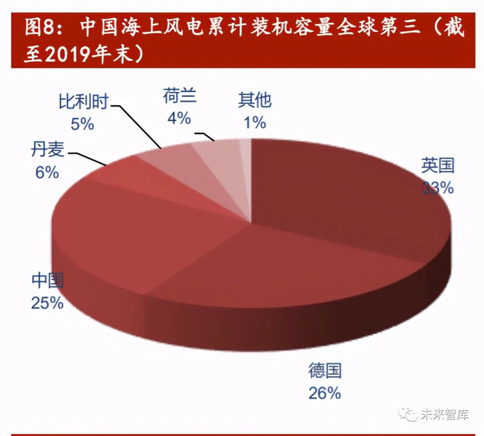 我国现已成为仅次于英国、德国的海风第三大市场。经过“十二五”时期的示范 探索,我国海上风电产业技术逐步成熟、制造能力快速发展、标准体系不断完善, 各方面条件基本成熟,“十三五”时期,我国海上风电正加速发展。截止2019年, 我国海上风机累计装机容量达到6.8GW,已成为仅次于英国(9.7GW)和德国(7.5GW) 的第三大海上风电市场。