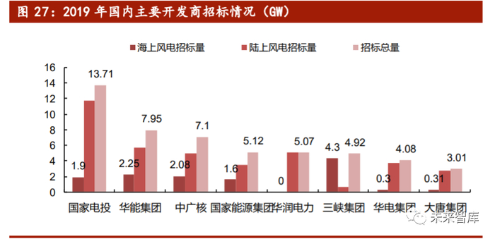 国内主要的开发商为五大集团及其下属能源公司,包括南方电网综合能源有限公 司、华能、大唐、申能、国家电投、三峡、中核、中广核等。随着海上风电补贴 逐步退坡,对开发商的专业化能力和精细化管理能力的要求在不断提升,开发商 逐步呈现头部化趋势,行业集中度不断攀升。2019 年,中国风电市场公开招标 量达 68.38GW,其中陆上风电公开招标量为 52.17GW,海上风电公开招标量为 16.21GW。排名前 8 的开发商合计招标容量为 50.96GW,占全部招标量的 75%,行 业集中度较高。