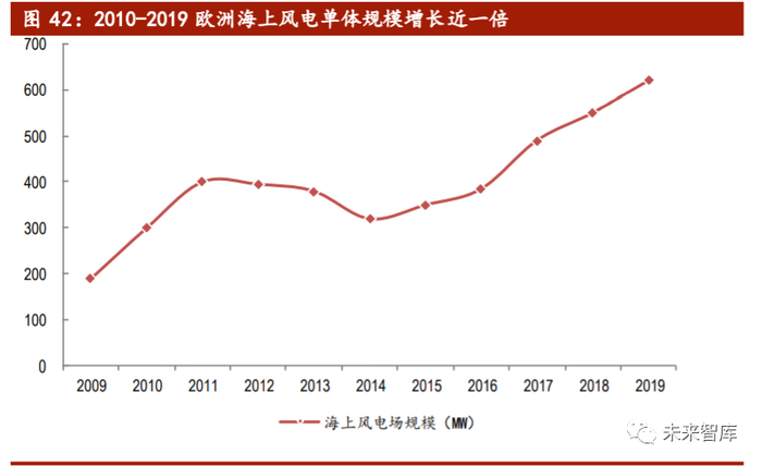 纵观欧洲海上风电发展历程,海上风电场规模逐年递增。在过去 10 年中,欧洲 海上风电单个项目的规模几乎翻了一倍,从 2010 年的 313MW 增加至 2019 年的 621MW。与欧洲相比,国内海上风电项目普遍偏小,2019 年 8 月 28 日公示中标 结果的上海市杭州湾北部海域奉贤海上风电项目,单体项目规模只有 200MW,2019 年 9 月 20 日英国第三轮 CfD 海上风电竞标,中标的单个项目规模为 1200 MW, 是上海奉贤项目的 6 倍。规模的扩大使得开发商在供应链上的议价能力大大加强, 从而带来采购上的规模经济,进一步促进了成本的下降。