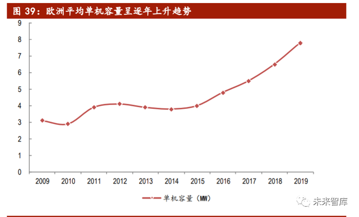 风机大型化在有效提升单机发电量的同时,可大幅降低安装、运维成本,对降低 海上风电度电成本意义重大。2017 年以前,欧洲主流的海上风机平均功率不足 5MW,随后数年,单机功率不断提升,2019 年,欧洲海上风电机组的平均单机容 量已经达到 7.8MW,自 2014 年以来,风电机组的单机容量年化增长率高达 16%。据统计,在发电量方面,单机功率为 10MW 的风机比 8MW 的风机提升近 30%。除 了发电量的提升外,大功率风机还可以有效降低成本,在同样的装机规模下,单 机功率越高,所需安装的风机台数越少,可大幅降低吊装成本与后期的运维成本。
