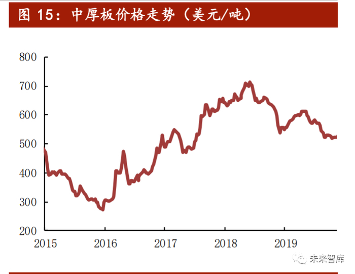 整机中零部件成本占比最大的是叶片和塔筒。玻纤和碳纤维是叶片生产的主要原 材料、中厚板是塔筒生产的主要原材料,均属于成本导向型行业。因此钢材和碳 纤维等原材料价格对叶片、风塔的制造成本及出售价格影响极大。自 2012 年以 来,我国进口碳纤维价格一路走低,目前在 1.6 万美元/吨附近波动;玻璃纤维 价格企稳。2019 年钢材价格稳中有降,中厚板价格处于 540 美元/吨附近,处于 行业价格中高位水平,在钢材加工业经历产能过剩和去产能两阶段后,钢价趋于 稳定。总体来看,上述原材料价格整体呈现企稳或小幅下降的趋势,意味着风电 制造的主要原材料价格处于平稳下行通道。