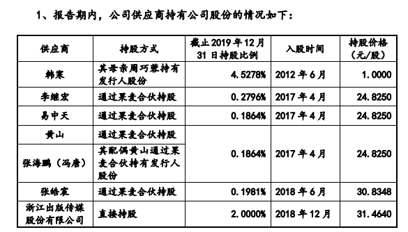 果麦文化的股东名单同样星光熠熠,韩寒、易中天、冯唐等均在果麦文化间接持股。韩寒作为公司创始股东的关联方,由其母亲周巧蓉持有上市公司4.53%股份,持股成本1元/股。