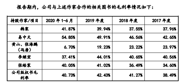 一众在果麦文化的持股作家中,谁的水最赚钱。招股书显示,图书毛利最高的是易中天,今年上半年,易中天相关图书毛利率达54.85%,其次为韩寒41.87%、张皓宸40.05%,李继宏37.41%。