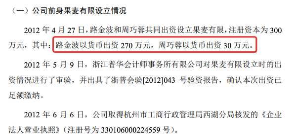 果麦文化的前身为果麦文化有限公司,成立于2012年4月,由路金波和周巧蓉共同出资设立。其中,路金波出资270万元占90%股份,周巧蓉出资30万元占10%的股份。