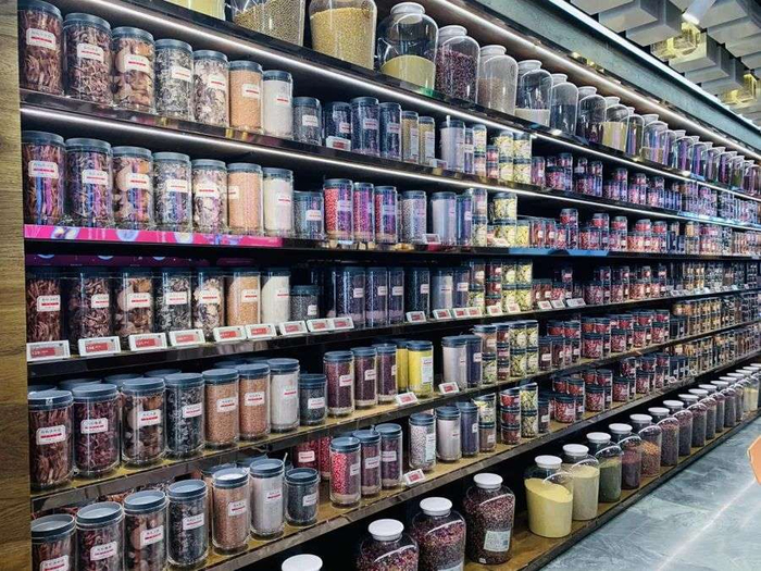 店铺一楼左侧是零售区,整齐摆放的罐装中药材等与天花板齐高,上面满满地陈列着蜂蜜、有机小米、玫瑰花、大枣、山药、有机黑米、有机薏仁米、蛋白粉等药食材,更是网红必打卡区域。
