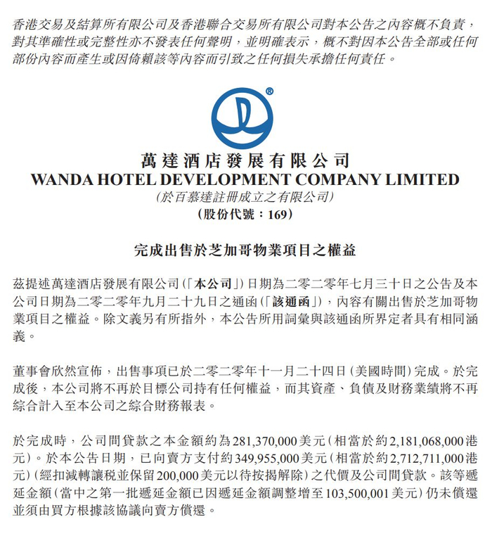 11月25日晚间,万达酒店发展公告,美国时间11月24日,公司完成出售芝加哥物业项目,公司将不再持有目标公司任何权益,目标公司的资产、负债及财务业绩将不再综合计入公司的综合财务报表。至此,万达集团已将其海外地产项目全部清空。