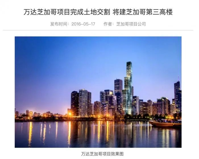 据万达集团官网发布的信息显示,该集团曾在2014年7月8日宣布将投资9亿美元在美国芝加哥建设一座高350米,地上89层的五星级酒店及公寓项目,建成后将成为芝加哥第三高建筑,成为芝加哥新地标。官网信息还显示,芝加哥万达大厦项目是2013年来万达集团继英国伦敦、西班牙马德里之后在全球投资的第三个五星级酒店项目。