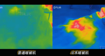 在温感仪的记录下。看~2分钟的时间内,普通暖被机才升温2度,而斗禾暖被机已经将温度从24度到36度升温了12度!