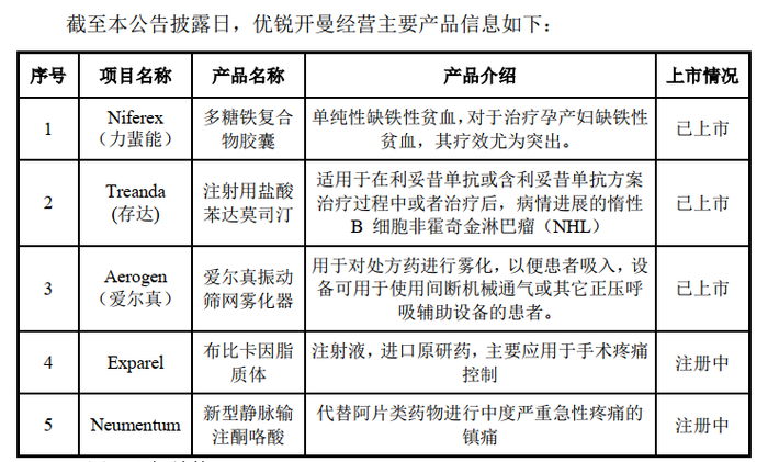 优锐开曼设立于开曼群岛,主营业务为自有医药产品运营、授权医药产品上市和推广、医药产品的推广和销售,主要聚焦手术镇痛、呼吸疾病及补铁剂三个领域,主要通过二级全资子公司优锐医药科技(上海)有限公司开展实际运营。